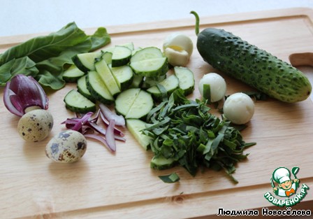 Сделаем легкий салат. Нарубим зелень кольраби, петрушки, нарежем красную луковицу, огурец, добавим вареное яйцо, приправим солью, перцем. Сдобрим заправкой из лимонного сока, оливкового/раститель ного масла