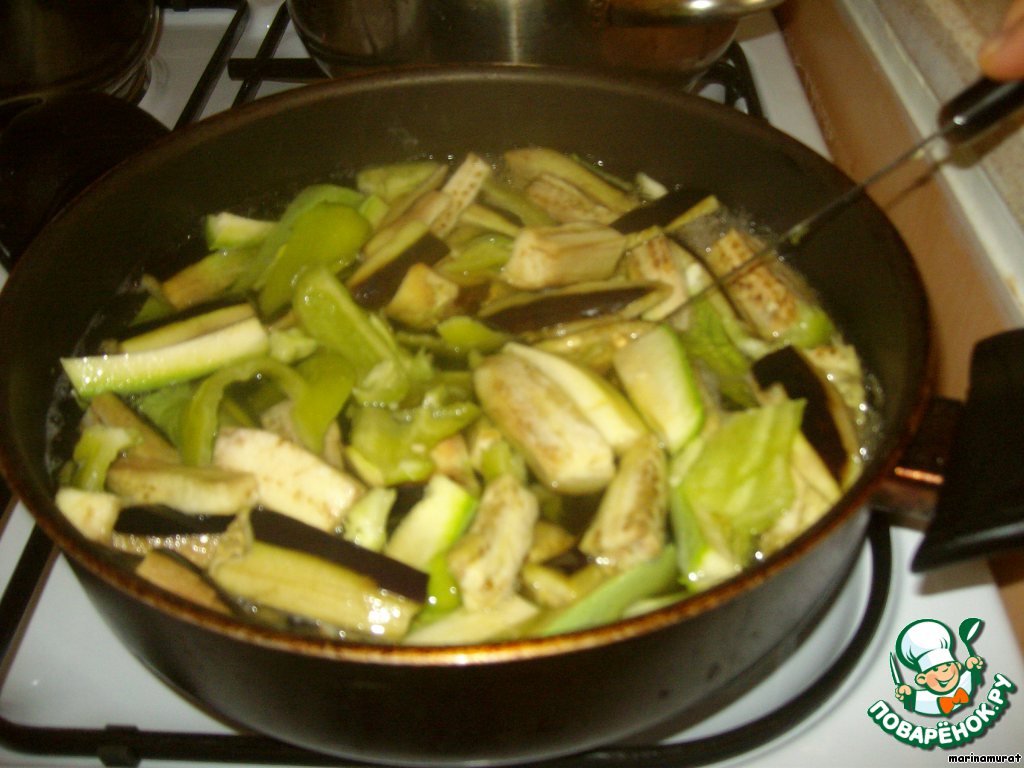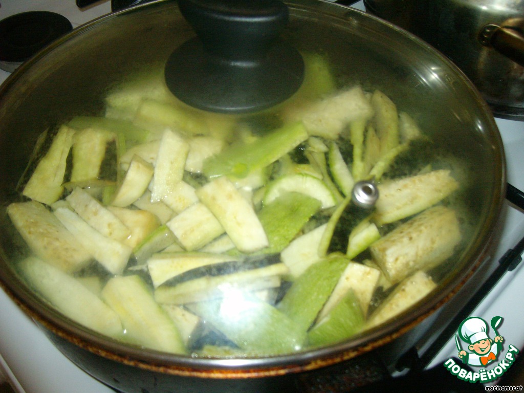 Режем крупно баклажаны, цукини и перец, все складываем в глубокую посуду, заливаем водой и варим минут 10-15 под закрытой крышкой.