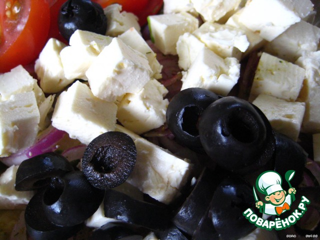 Добавить оливки, нарезанные на 2-3 части и сыр "Фета" - кубиками.
