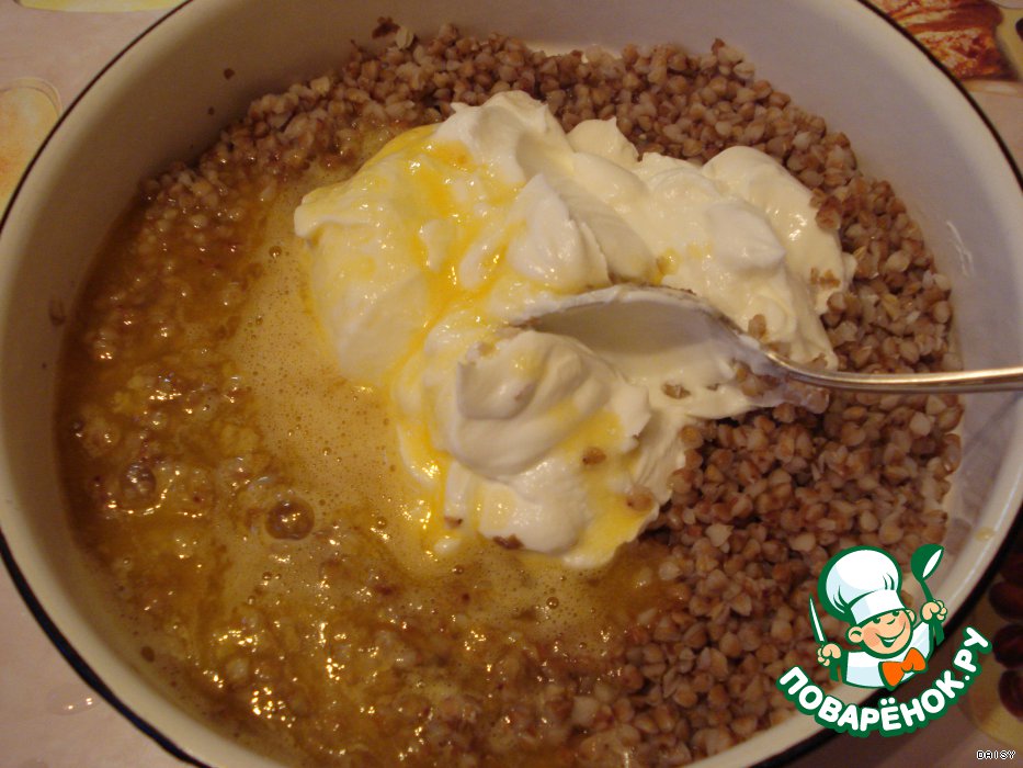 Яйца взбить с сахаром, тщательно растереть с творогом, перемешать с остывшей гречкой. Можно, по желанию, добавить изюм или какие-то сухофрукты. Выложить в емкость, смазанную жиром. Я это блюдо готовлю в пароварке, поэтому мне жир не нужен. Смазать сметаной, поставить в заранее нагретую духовку минут на 15 для запекания. Огонь не должен быть сильным. В пароварке я готовлю 20-30 минут.