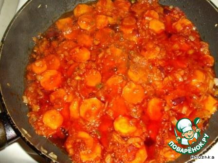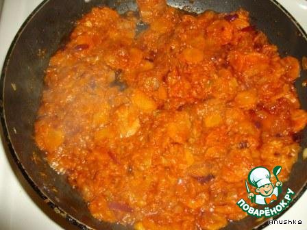 Делаем «зажарку» Лук режем мелко, морковь кружочками – обжариваем на масле с добавлением молотых перцев.