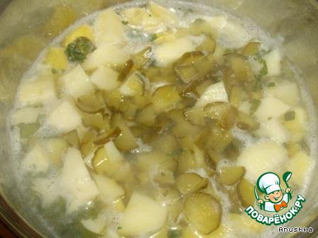 Картошка закипела, минут через 5 добавляем соленые огурцы и сушеный сельдерей. Закипает