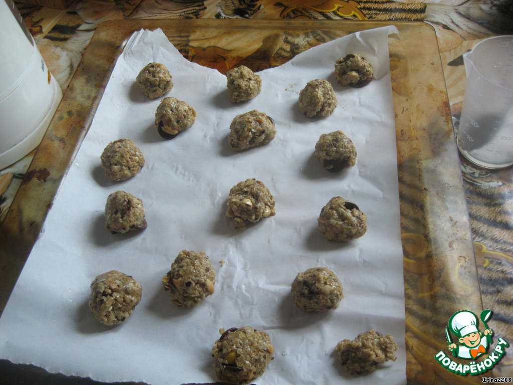 Скатать шарики (мокрыми руками) и выпекать при 200 град. минут 20 (до зарумянивания). Печенье получается мягким. Если хотите хрустящее - надо сделать их более тонкими