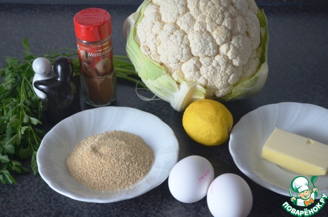 На блюдо выложить готовую капусту, полить её соком лимона и немного посыпать тёртым, мускатным орехом. Сверху посыпать обжаркой из яиц и панировочных сухарей. Украсить петрушкой и одним порезанным яйцом.