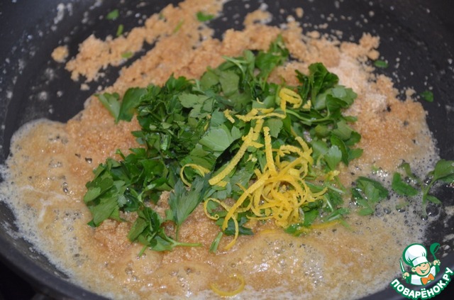 В сковороде растопить масло, добавить панировочные сухари, шкурку лимона, порезанную петрушку и одно порезанное яйцо, соль, перец, немного всё вместе обжарить.
