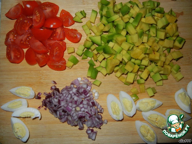 Креветки очищаем и нарезаем мелкими кусочками. Перепелиные яйца отвариваем вкрутую, очищаем и нарезаем четвертинками. Помидоры-черри также нарезаем четвертинками. Мелко нарезаем лук. Авокадо очищаем, достаем косточку и нарезаем мякоть мелкими кубиками.