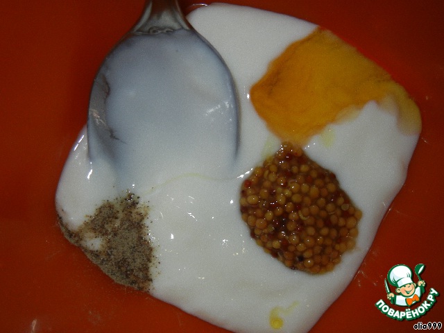 Готовим заправку. Смешиваем йогурт, горчицу, мед. Солим, перчим по вкусу и заправляем салатик. Также для заправки вместо йогурта можно использовать смесь оливкового масла, лимонного сока (или бальзамического уксуса), меда и горчицы.