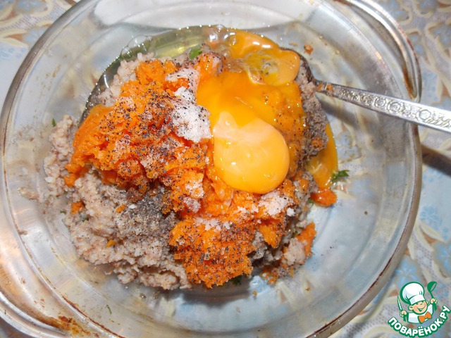 Затем соединить все ингредиенты, посолить и поперчить.. добавить яйца.