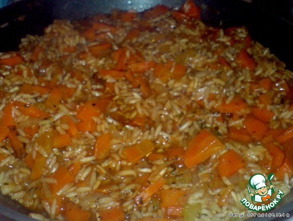 Коричневый рис готовится дольше, чем белый. После начала добавления бульона понадобится минут 25. За 10 минут до готовности (то есть примерно через 15 минут как добавили бульон) приправляем базиликом, паприкой и чили. Перемешиваем и добавляем кетчуп.