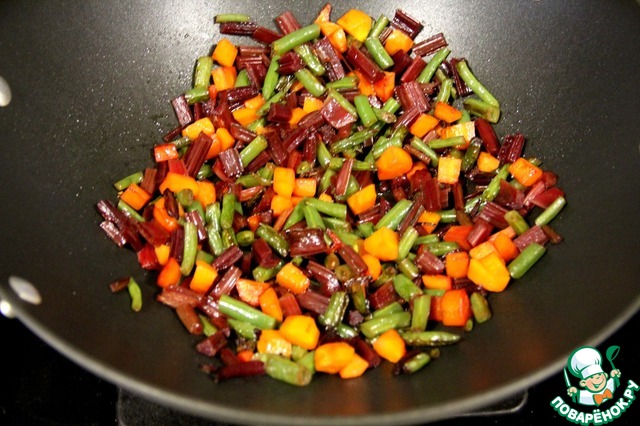 На сковороде ( у меня сковорода-вог ) потушить черешки свеклы, морковь и зеленую фасоль на растительном масле. Примерно 20-25 минут.
