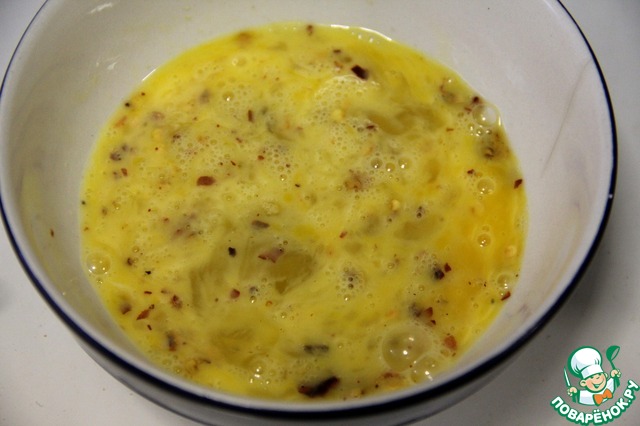 Яйца смешиваем с красным перцем, чесночным порошком, солью и перцем и немного взбиваем.