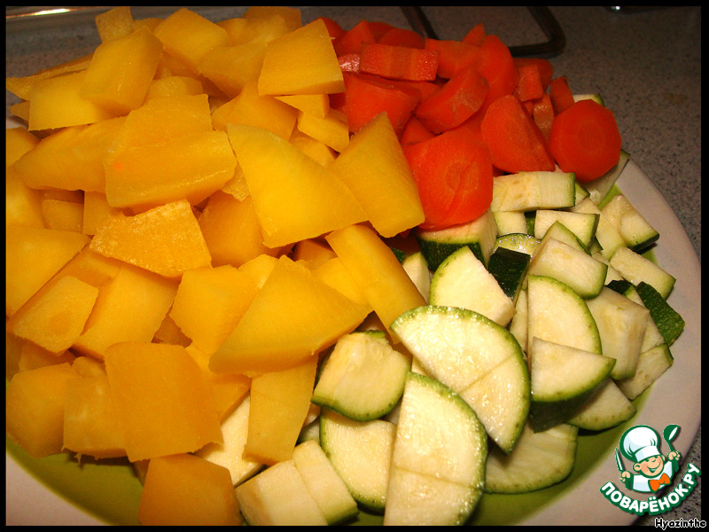 Репу и морковь чистим, промываем, крупно нарезаем,