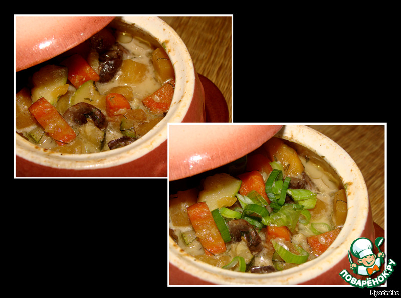 При подаче содержимое горшочка перемешиваем и посыпаем зеленым луком, укропом.