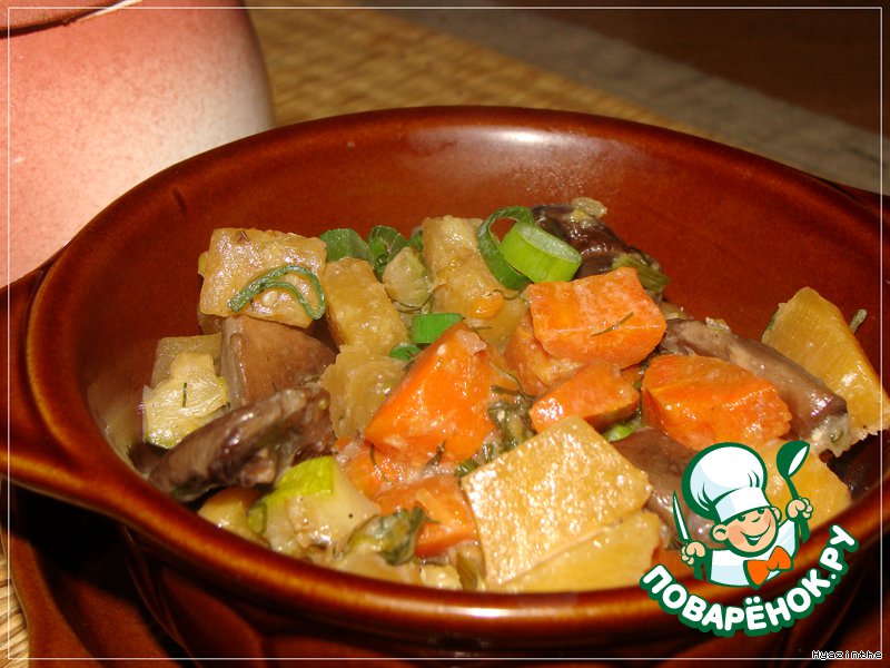 | Блюдо приготовлено в горшочках (опять горшочки! :) ) Для любителей овощей, для сидящих на диете - красивое, аппетитное овощное блюдо. Можно использовать в качестве гарнира к мясу, тефтелям. |