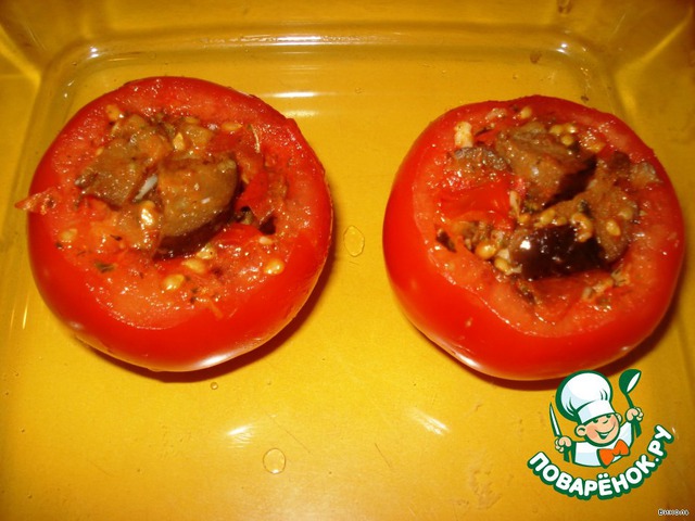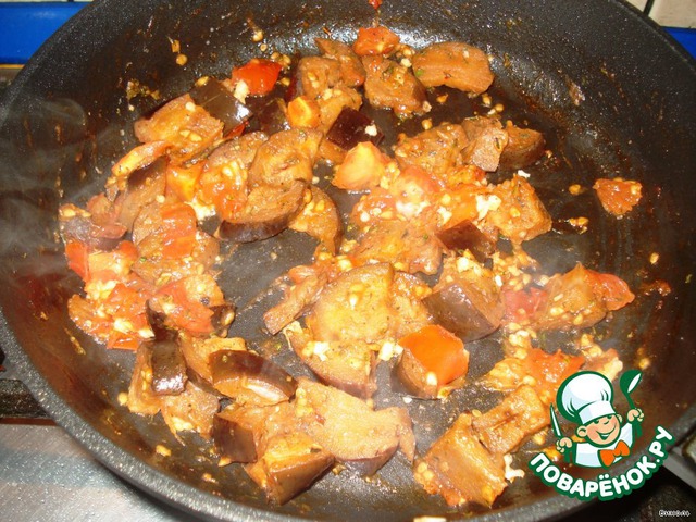 Баклажаны обжарить вместе с внутренностями помидорок, в конце добавить измельченный чеснок, посолить, поперчить