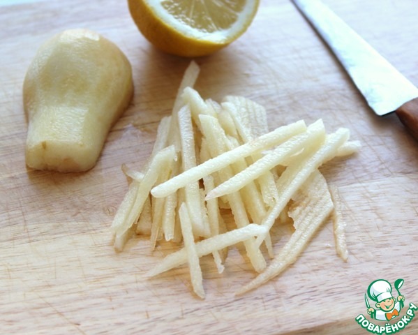 Грушу очистить, нарезать соломкой, сбрызнуть лимонным соком