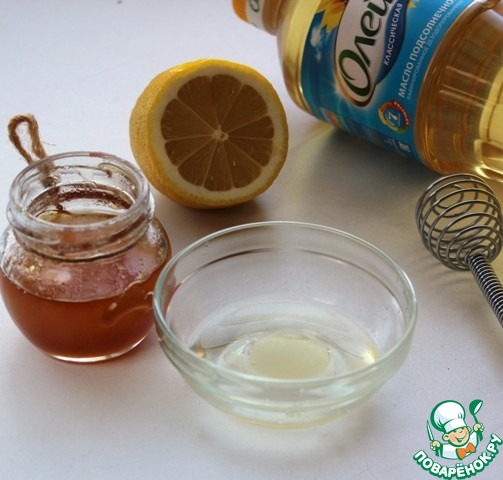 Сделать заправку. Смешать подсолнечное масло, мед, лимонный сок.