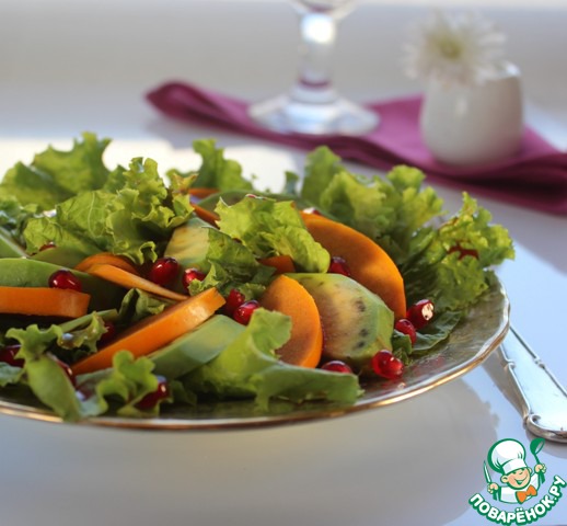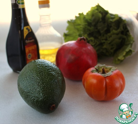 Главные фигуранты салата; хурма, авокадо, гранат, листья салата.