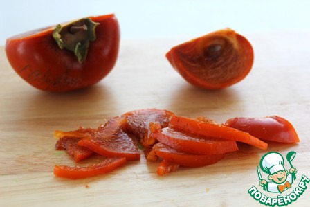 Хурму нарезать на четвертинки, удалить косточки и нарезать тонкими пластинками