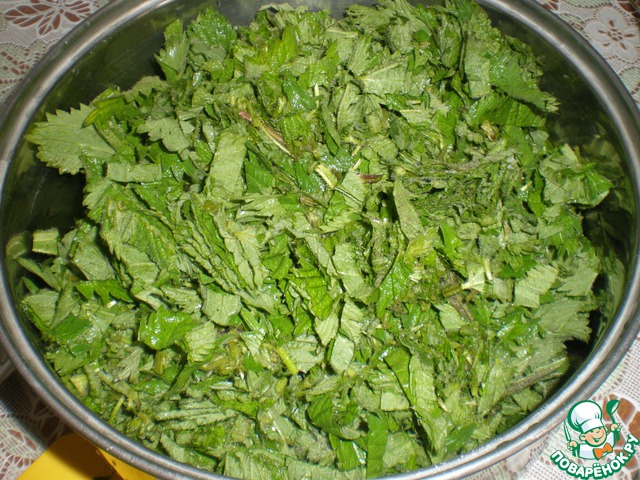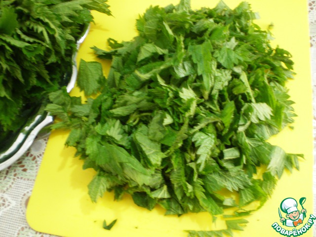 Слегка просушенную крапиву нарезаем. Мелко нарезать не обязательно, мы ее будим тушить.