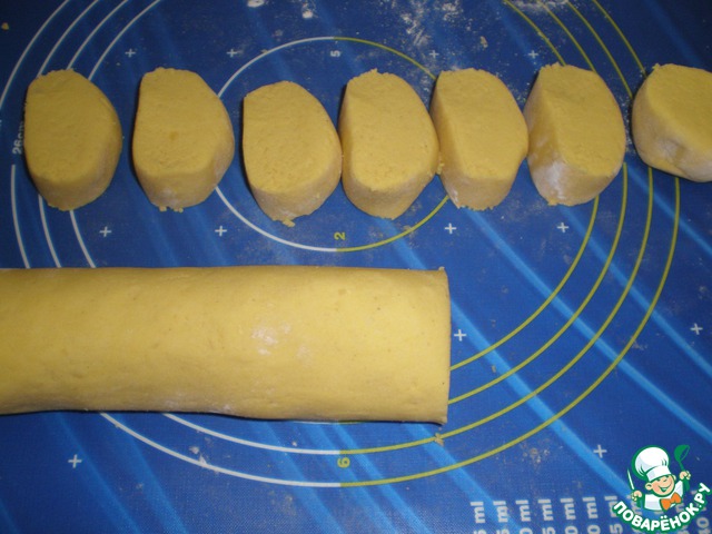 Тесто скатываем колбаской и нарезаем на одинаковые части. У меня получилось 16 шт.
