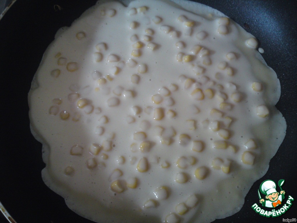 На сковороде, добавив пару капель масла, выпекаем четыре кукурузных блина