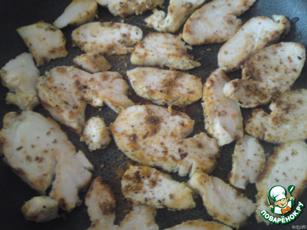 Курицу режем на кусочки и обжариваем на быстром огне 2 минуты, добавляем соль и чили