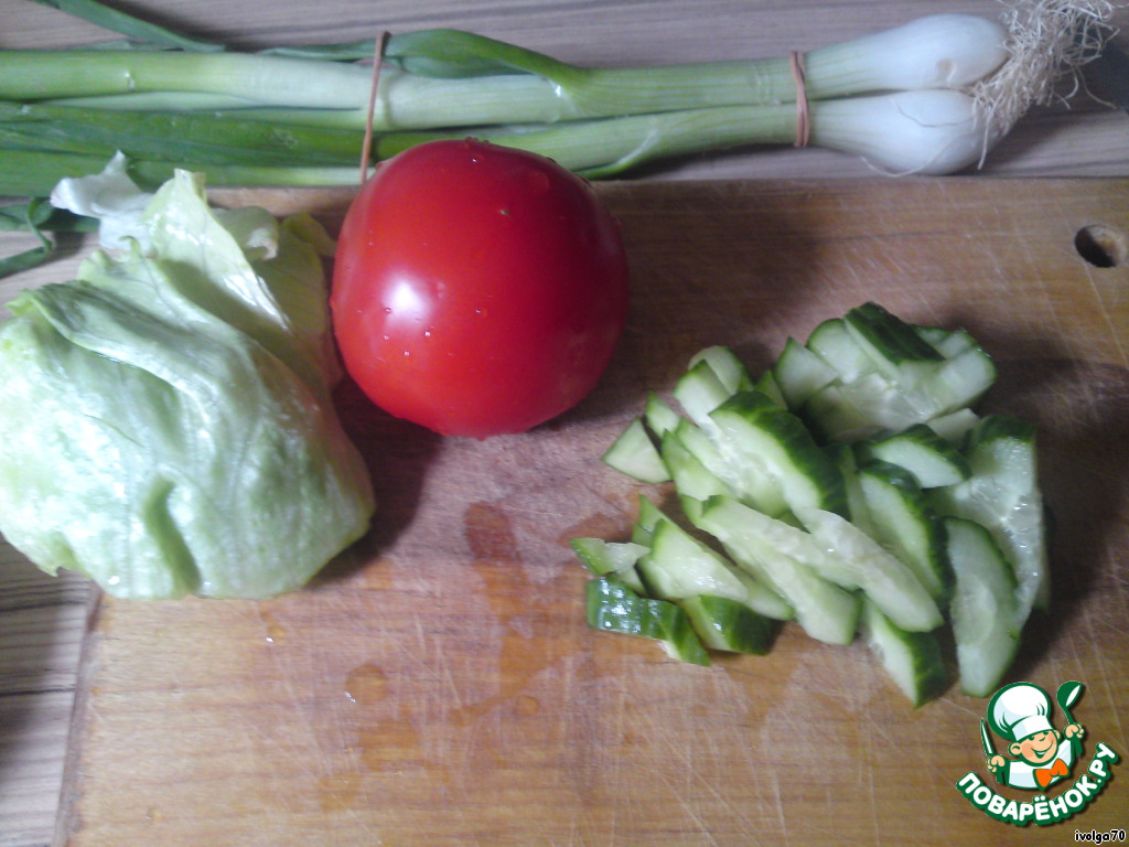 Помидор, огурец и лук смешиваем, приправляем томатным соком и соусом Табаско, также добавляем на ваш вкус перец и соль.
