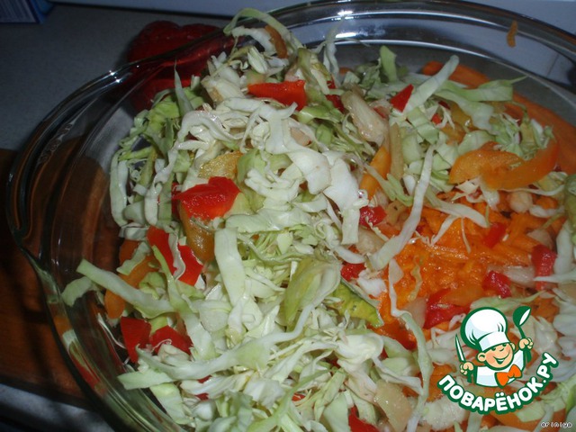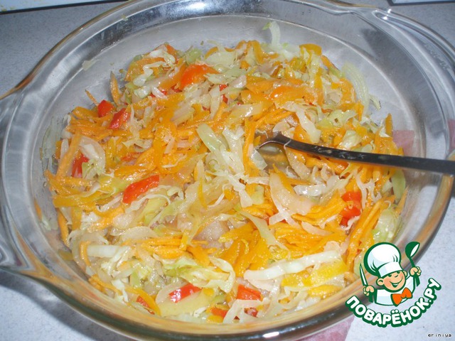 В Свч на 10 мин, под крышкой. Добавить лавровый лист. Посолить, немного сахара и еще на 5 мин.