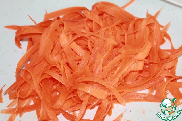 Морковь с помощью овощечистки нарезаем полосками. Полоски должны быть примерно одинаковой длины и ширины.