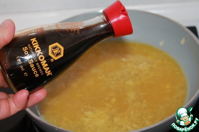 Добавляем соевый соус Kikkoman и немного сахара для баланса вкуса. Нам необходимо получить кисло -сладкий соус.