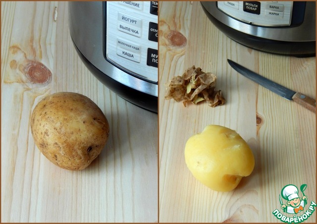 Отварить картофель в мундире в течении 20 минут. Можно сделать это в мультиварке в режиме «Мультиповар», установив температуру 150гр.