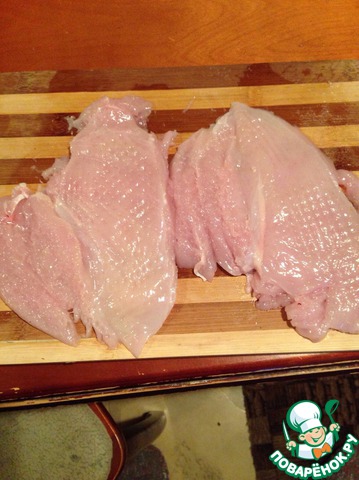 На стол кладем пищевую пленку, грудку; сверху режем сыр грамм 30, и мелко рубим 2 корнишона.