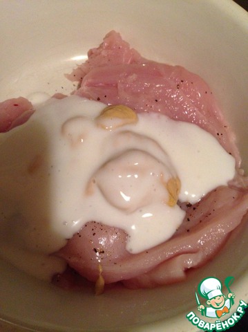 Кладем в емкость, наливаем кефира и кладем горчицу. Обмазываем грудки и убираем минут на 30 в холодильник