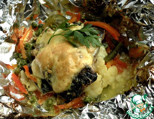 Фольгу, сложенную вдвое, смазываем половинкой столовой ложки растительного масла, чтобы при запекании ничего к ней не прилипло. Также можно положить кусочек пергамента.