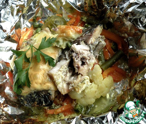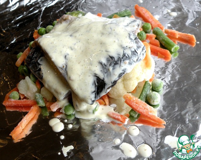 Выкладываем овощи (можно присолить по вкусу) и сверху кусочки рыбы, смазывая сметаной.