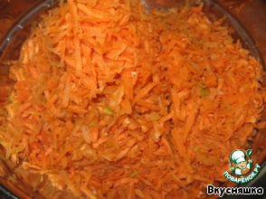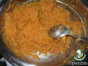 Когда морковь протушится, добавить манку, хорошо мешать.