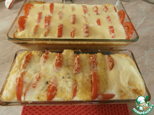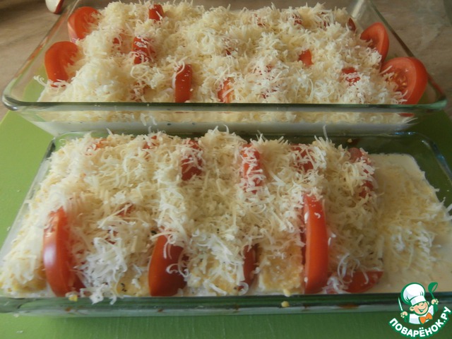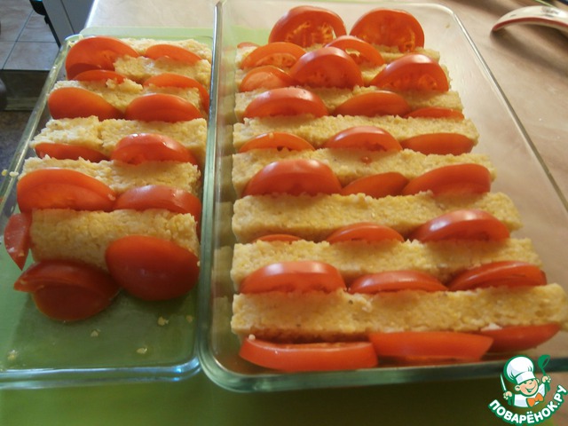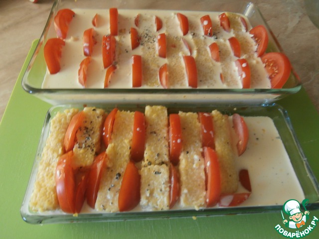 Поленту, выложенную в смазанную оливковым маслом форму для запекания, разрезать на кусочки шириной 2 см, прослаивая дольками помидоров.