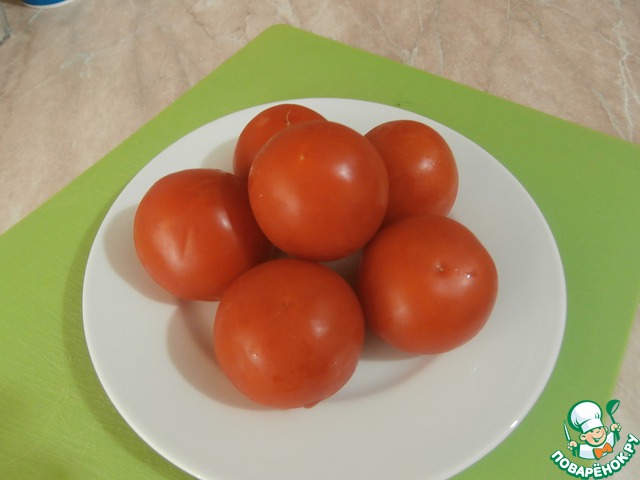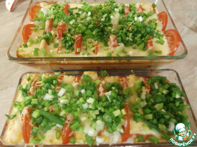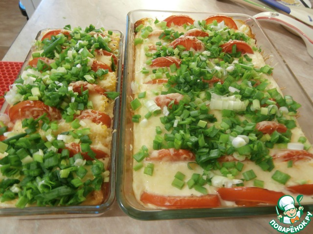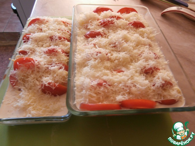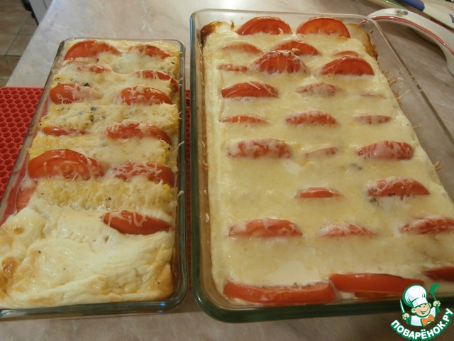 Вам придётся вынуть несколько кусочков поленты, т. к. их место займут дольки помидоров. Для этого я специально приготовил ещё одну форму для запекания, размером поменьше.