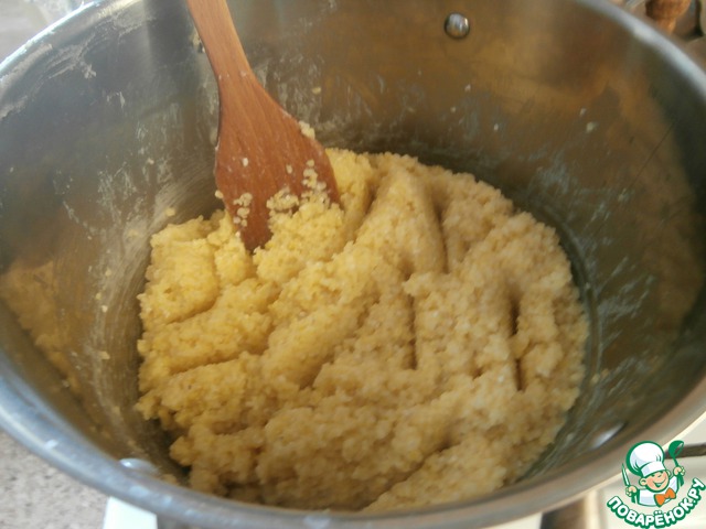 Помешивая деревянной лопаткой, всыпать 300 г кукурузной крупы, посолить по вкусу.