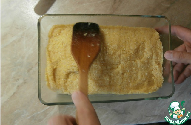 Деревянной лопаткой, смоченной в воде, разровняйте поверхность поленты.