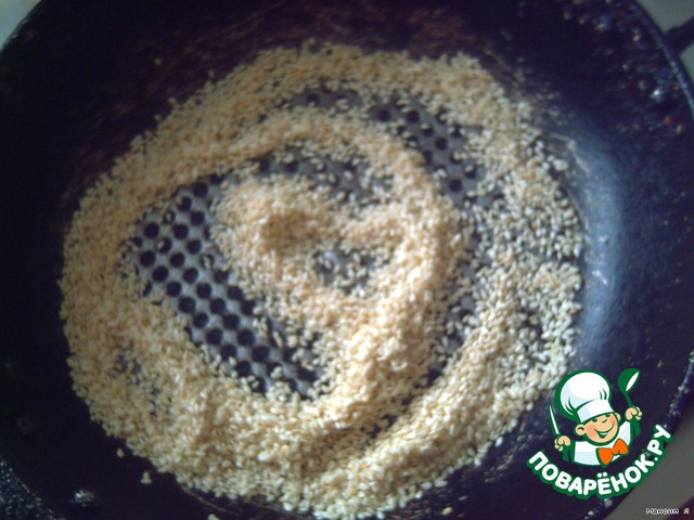 Ставим вариться гречку, а в это время обжариваем на сухой сковородке 2-3 ст. ложки семян кунжута. И высыпаем его в мисочку, он нам пригодится чуть позже.