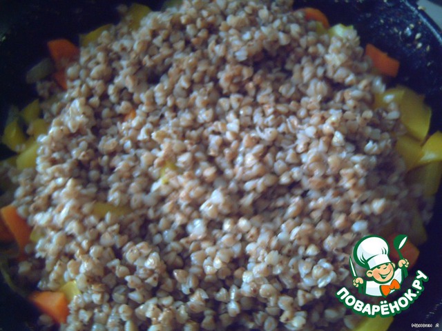 Потом тушим это минут 10 и добавляем туда гречку, так как она у нас уже почти готовая, то тушим еще 5 мин. И все!