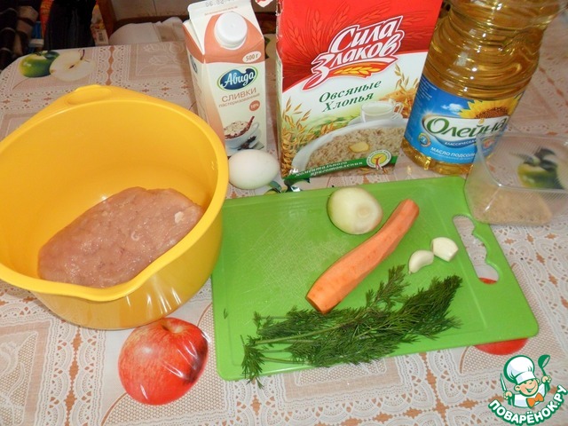 Овсяные хлопья зальем кипятом. В фарш добавляем указанные продукты (морковь на мелкой терке, лук и чеснок мелко порезать, но я их тоже натерла на мелкой терке)- так сочнее будет фарш. Затем добавляем панировочные сухари, яйцо, сливки или молоко, оливковое, мелко рубленную зелень. Также не забудем добавить разбухшие овсяные хлопья. Солим, добавляем специи и хорошо вымешиваем.