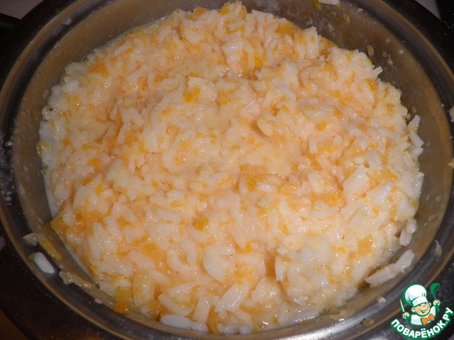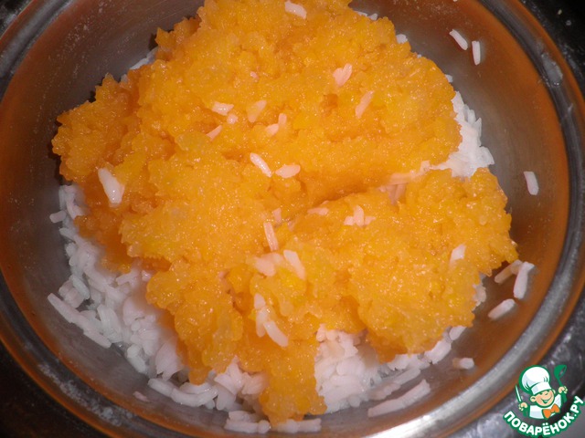 Рис отварить до полуготовности в подсоленной воде. Добавить пропущенную через мясорубку сырую тыкву.
