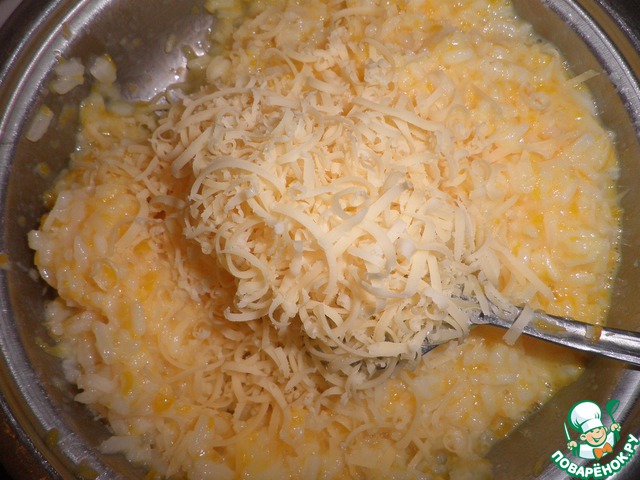 Затем кастрюлю с кашей плотно накрыть крышкой, настаивать 20-25 мин. Затем в кашу ввести сырое яйцо, натертый на мелкой терке сыр и тщательно перемешать.