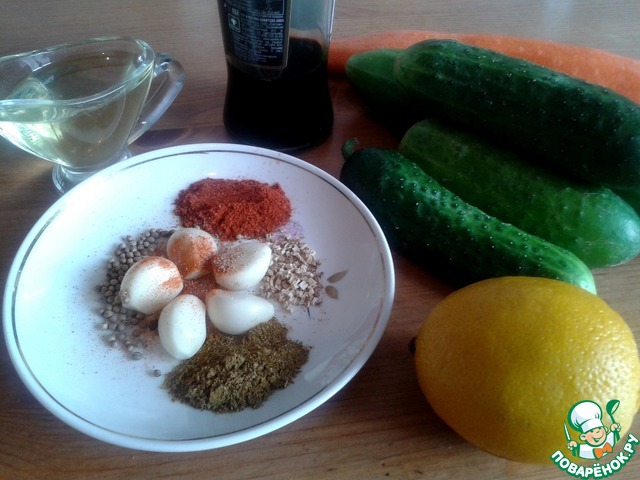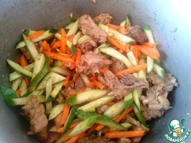 А в это время подготовим продукты для маринада и основного блюда. Морковь и огурцы нарезаем крупной соломкой.