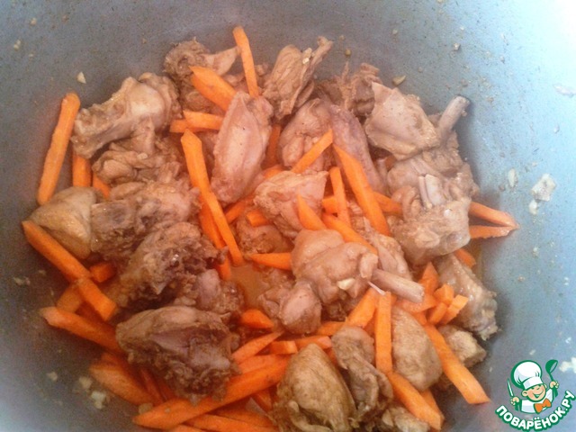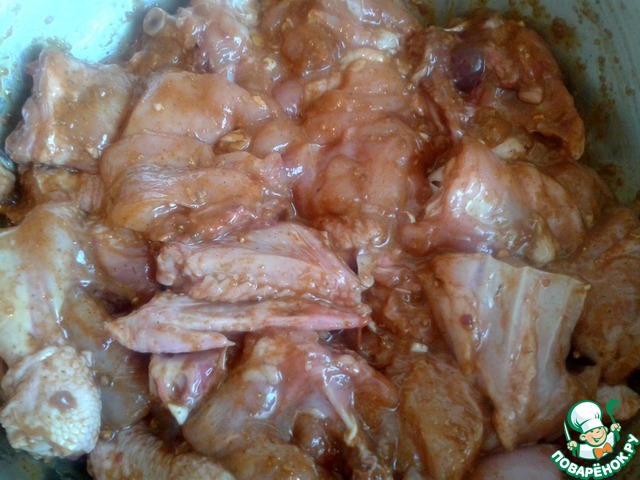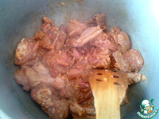 В казане нагреваем 1 столовую ложку растительного масла, перекладываем туда курицу вместе со всем маринадом, обжариваем 5 минут на максимальном огне при открытой крышке, потом закрываем крышкой, убавляем огонь и оставляем тушиться.