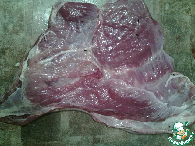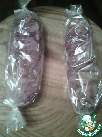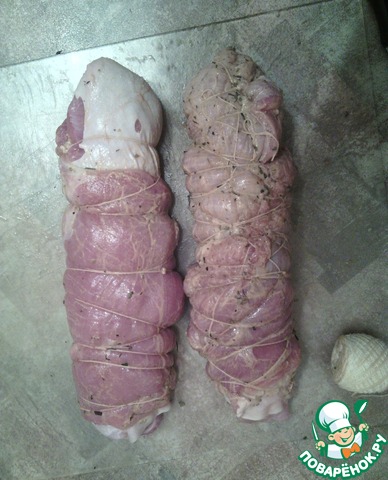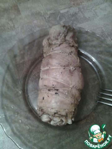 Вот уже готово. Счас сниму нитку и нарежу. (Кстати, тот бульёнчик, который остался в рукавах-не выливайте-шикарный холодец! Нежный, прозрачный)