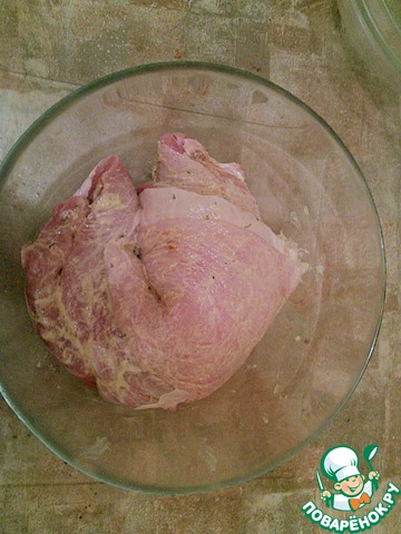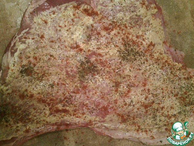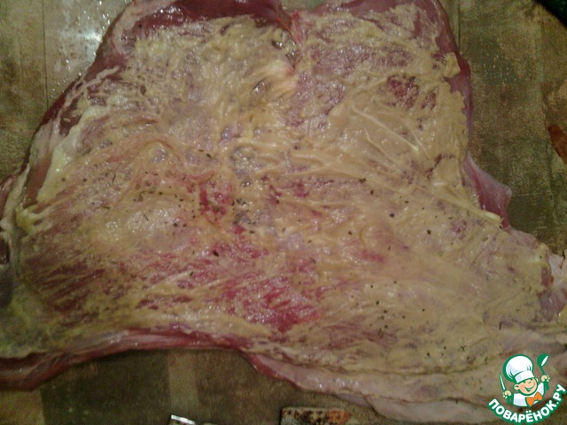 Натереть мяско смесью горчицы и майонеза и оставить на часок
